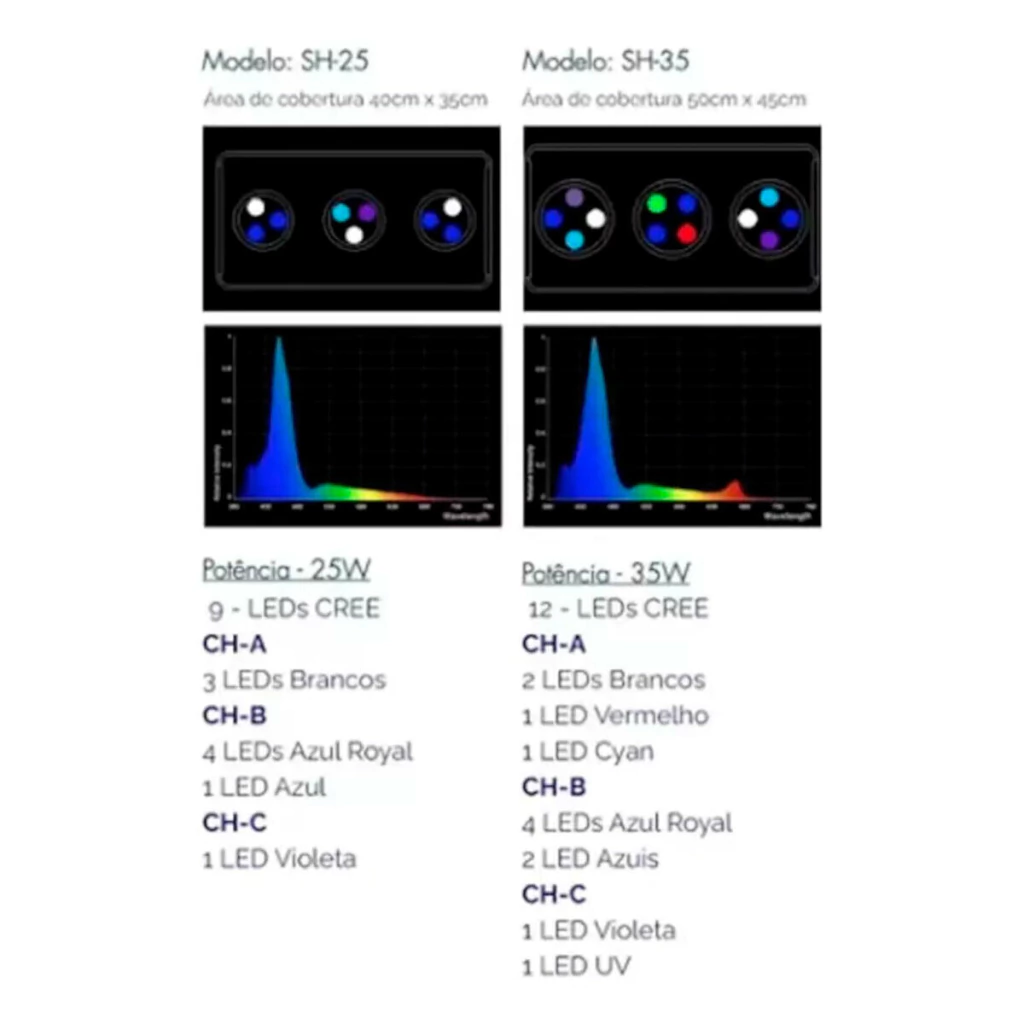 Com uma potência de 25W, esta luminária utiliza tecnologia LED Cree, garantindo uma iluminação intensa e de baixo consumo energético. O modelo Hikari Sh-25 é ideal para aquários com dimensões de 40 cm de comprimento e 35 cm de largura, proporcionando uma cobertura adequada para o crescimento saudável de corais.