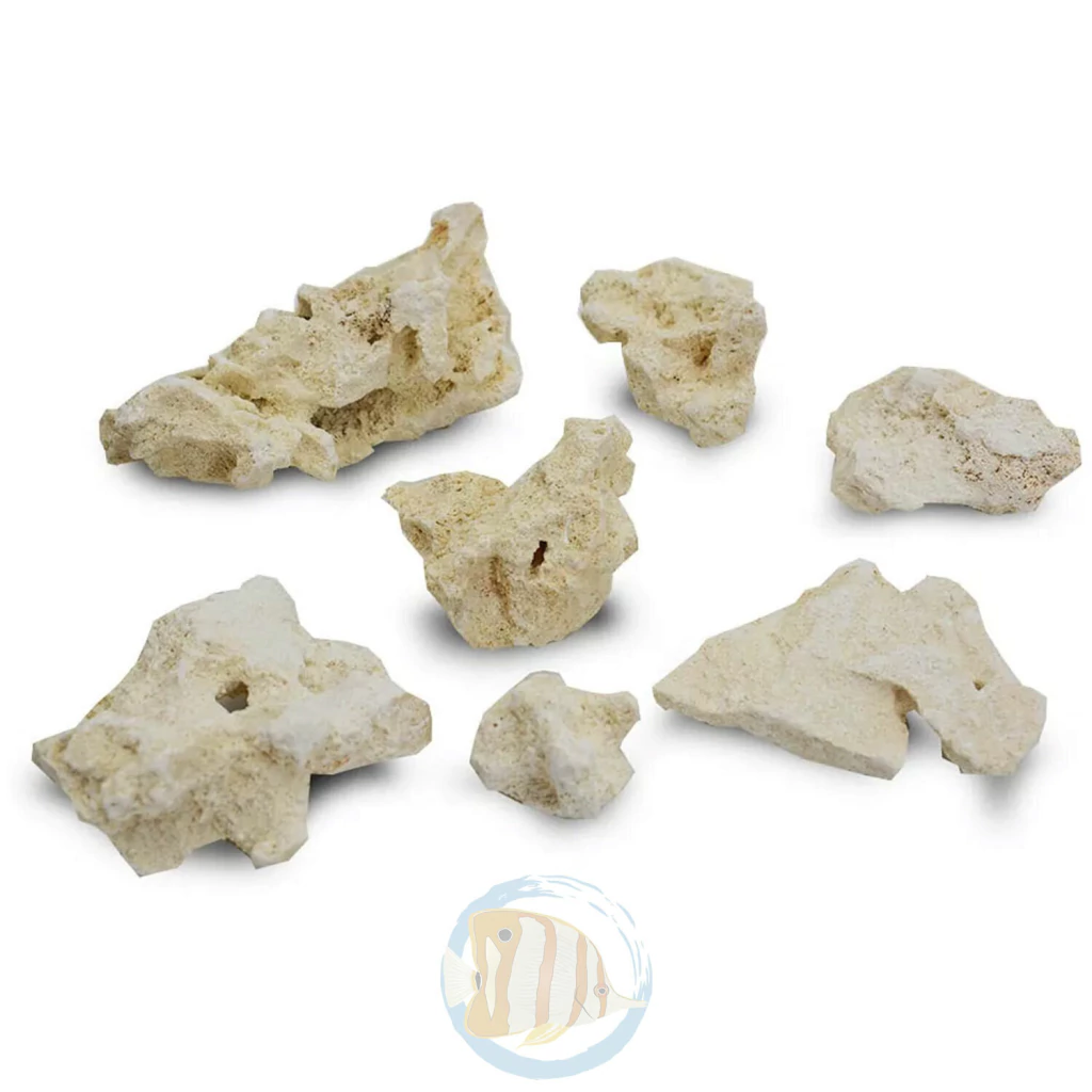 Contem 4kg de rochas entre 5 a 7,5cm. É um mix de pedaços menores de Premium Shelf (as famosas rochas platos) e Reef Saver. Contém cortes duplos e simples.